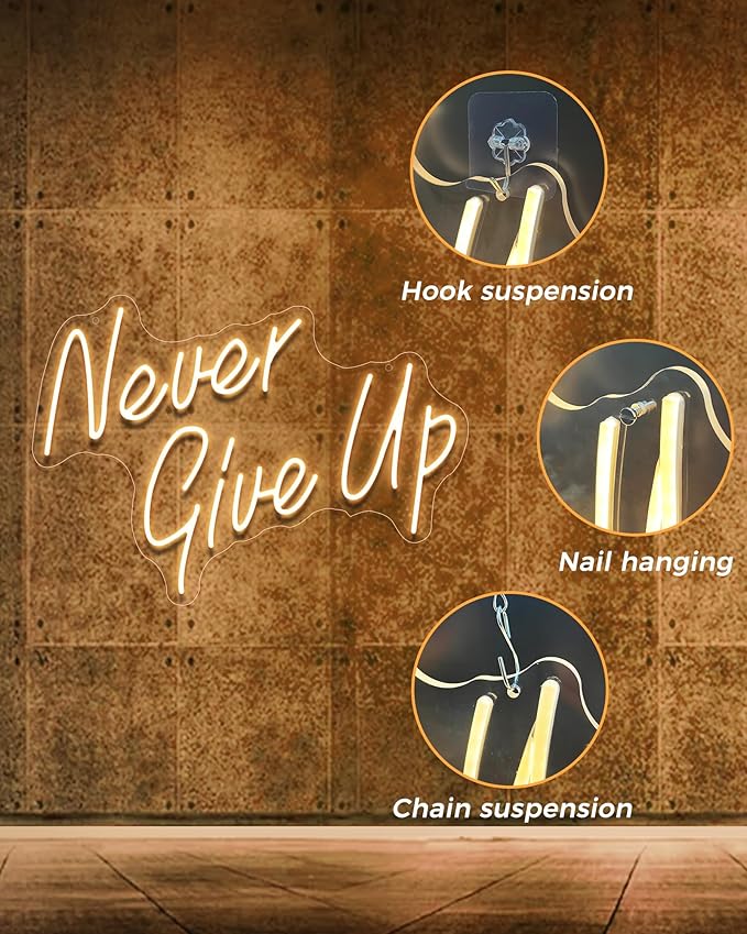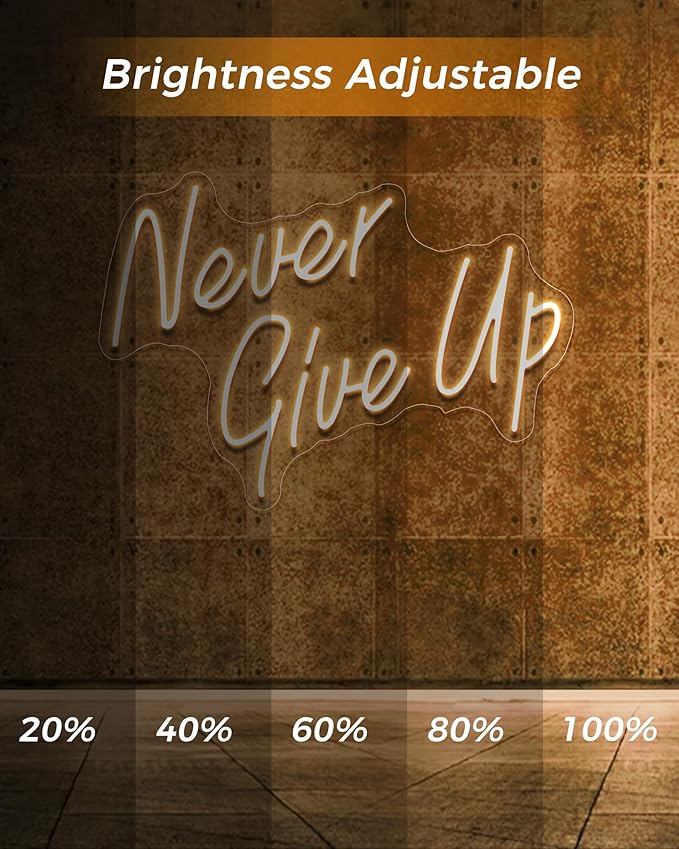 - Style & Material: The sign of NEVER GIVE UP(it means to Every stroke counts)neon light is an exquisite artistic neon light decor sign. The LED neon light's combination of yellow and white is novel. The Neon Signs are made of Acrylic LED, Silicon Strips, and ABS Material, with No risk of glass breakage or leakage of hazardous materials