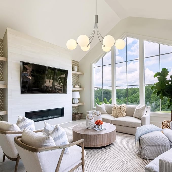 - [Modern Farmhouse & Mid Century Style] Brushed nickel globe chandelier light fixture is crafted by skillful artisans. The main part feature 6 milk white glass ball shades, with the light arm protruding from the central pillar like a tree branch. Whether it is in the common living room where you spend time with your loved ones, the dining room where you enjoy cooked meals, the chic chandelier fits right in to light up every moment spent inside the comfort of your home.