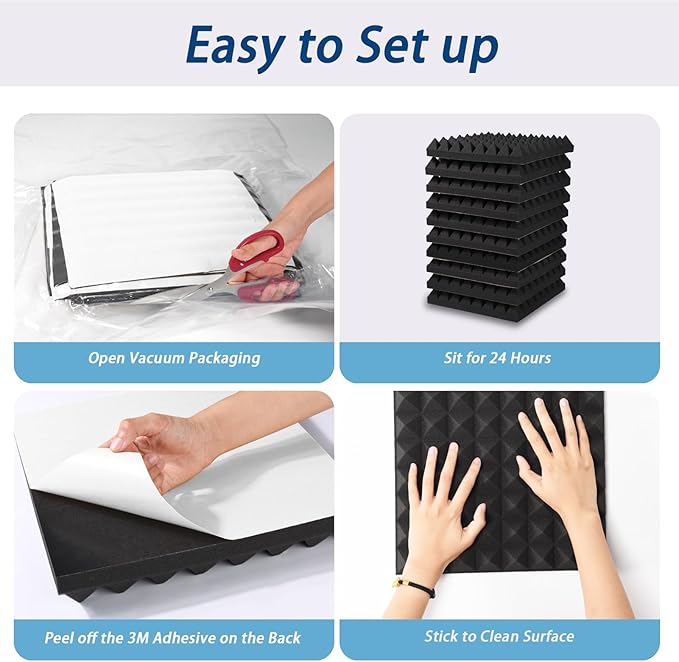 - Rapid Expansion Recovery: The elastic and tough sound absorbing foam only needs to be opened in vacuum packaging. Our acoustic foam uses dense and thick open-cell foam. It is highly recommended to place it in a ventilated place for 24 hours, and it will achieve the best sound proofing effect