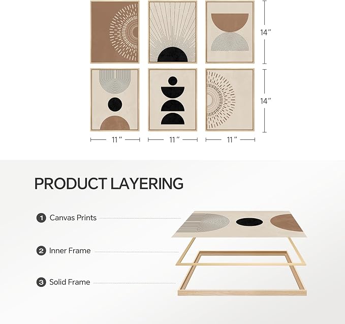 - Wood Framed Set: Our 6 piece neutral wall art set showcases modern boho designs with clean geometric lines. Use pastel black, brown and beige tones adding natural and warmth to your space. Each 11x14 piece.