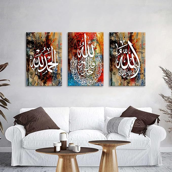 - Islamic Pictures Wall Decor Size - Each sign poster is 24x36" (60x90cm), 3 panels in total. Arabic calligraphy wall decor, allah name muhammad signs on abstract colorful background. Motivational saying quotes wall art for home decorative.Each abstract Islamic wall decor stretched on wood frame, ready to hang.