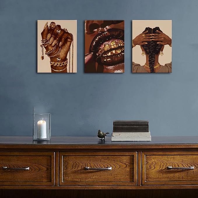 - ▶Fashion African Women Wall Art Size - Each black girls wall art is 12x16" (30x40cm), 3 panels in total. This black girl posters brings a abstract, afrocentric designs that celebrate African american beauty and culture. Perfect for adding depth and personality to any room, these prints are ideal for black girl wall decor and black woman wall art, creating a stylish focal point in any living room or bedroom.The wall decor comes wrapped in a canvas wood frame, hook mounted and ready to hang.