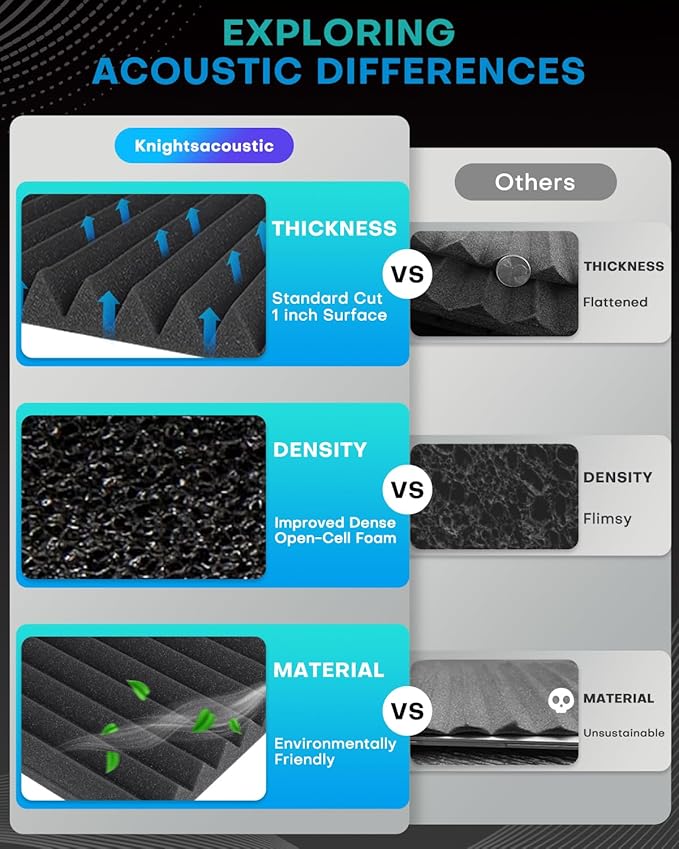 - PROFESSIONAL SOUND ABSORBING PROPERTIES – Our acoustic foam panels are expertly designed to reduce noise pollution by absorbing sound rather than blocking it. They minimize echoes and unwanted background noise, creating a cleaner, more focused audio environment. Unlike soundproofing, acoustic foam specifically manages reverberation, making it ideal for studios, recording booths, control rooms, and radio stations. Use our foam to eliminate standing waves and flutter in spaces of any size, ensuring professional-grade sound quality for your projects.