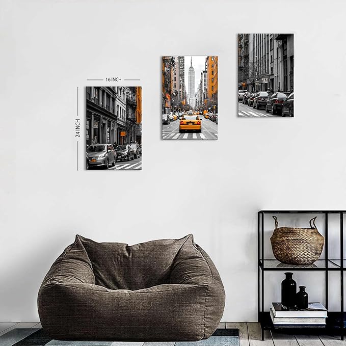 - ▶New York City Wall Art Size - Each New York city views wall art is 16x24" (40x60cm), 3 panels in total. This black and white artwork inspired by New York cleverly combines yellow taxis and urban architectural landscapes, showing the prosperity and tranquility of New York. It is suitable for embellishing the living room, bedroom or office, adding a unique charm to the modern home. Its design and color matching can give the space extraordinary charm.