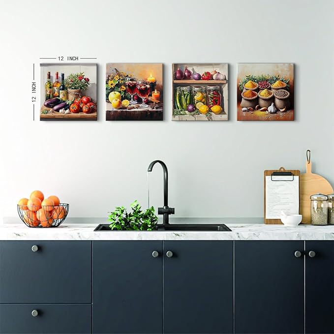 - 【Colorful Spices Food Wall Art Size】- 12x12in x 1pcs(30cm x 30 cm x 4), Colorful mason jar wall art vegetables spices food wall decor, kitchen decor already come with canvas wrapped wooden framed and hook mounted ready to hang. Spices canvas wall art, kitchen decor and kitchen accessories theme set.
