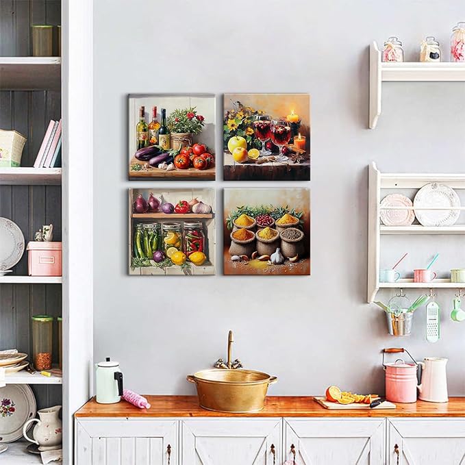 Kitchen Wall Art Colorful Mason Jar Wall Decor Farmhouse Spices Food Wine Herbs Vegetable Pictures for Dining Room Rustic Vintage Still Life Painting Canvas Prints Restaurant Home Decoration 12x12" 4P