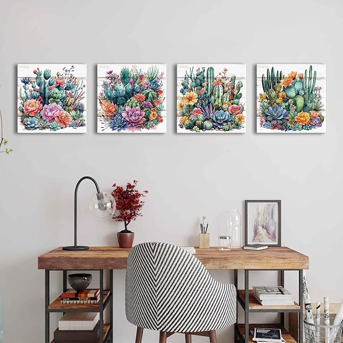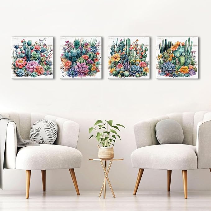 Cactus Wall Decor Bathroom Watercolor Succulent Wall Art Colorful Tropical Plant Flower Picture Boho Country Mexican Botanical Canvas Prints Artwork for Living Room Bedroom Home Decorations 12x12" 4P