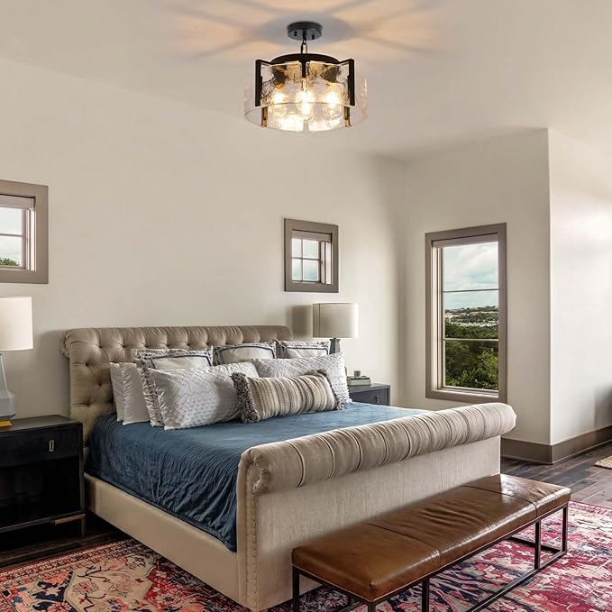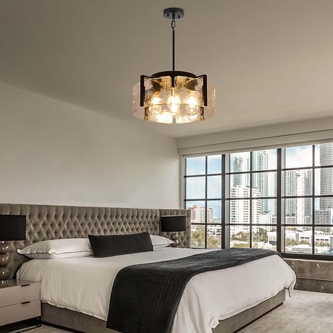 - Modern Chandeliers for Dining Room - The black chandeliers for dining room light fixture are made of high-quality matte metal frame and heat-resistant chandelier base, black spray paint process can prevent rust, no worries about the color fade or aging, prolonging the life of the fixture. The delicate clear hammered glass shade diffuses the light farther and brighter, protecting your eyes from glare while providing an elegant and wonderful projection through the seeded glass to enhance the overall aesthetics of the room