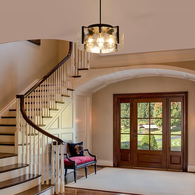 - Wide Applications - The foyer lighting fixtures are the perfect blend of modern and elegant, and the delicate clear hammered glass accents add a touch of luxury. Hanging light fixture can also stand up to steam showers, making chandelier for dining room a rated light fixture for wet locations. Whether you need foyer lighting fixtures, hallway light fixtures, living room light fixture, light fixtures for dining room ceiling, foyer chandeliers for high ceilings, kitchen light fixture, modern light fixture chandelier or laundry room light fixture, this vintage chandelier is the ideal choice