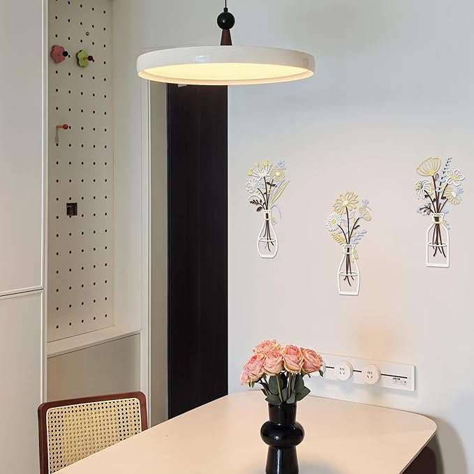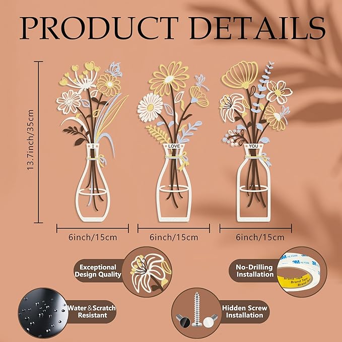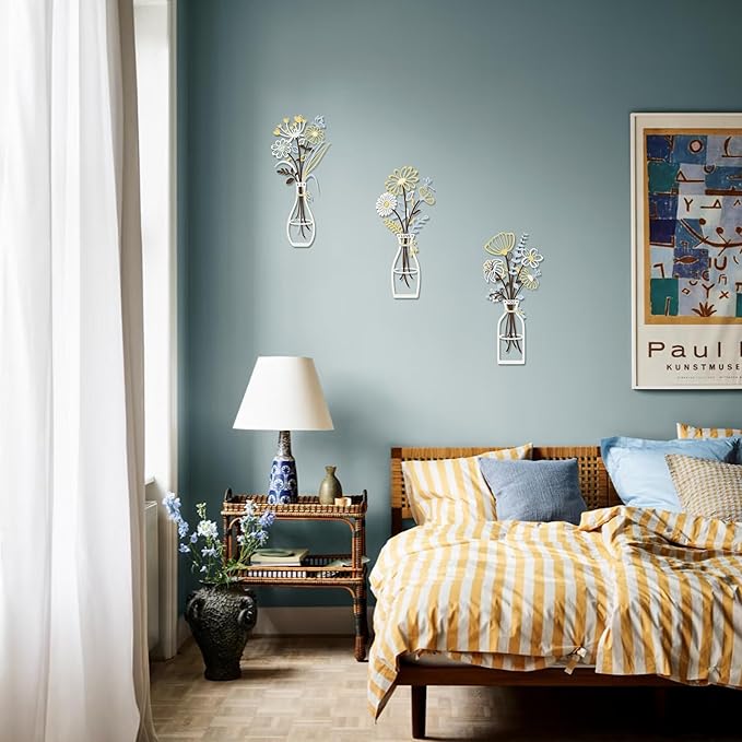 - Perfect for Any Room – RIJINDOUJIN 3-Piece Metal Flower Floral Vase Wall Art, blending minimalist design with rich color to brighten bedrooms, living rooms, hallways, kitchens, bathrooms, dining rooms, or workspaces.