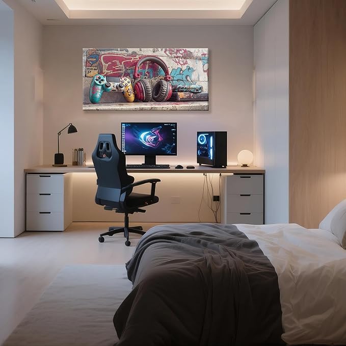 Large Game Wall Art Graffiti Gamepad Earphone Canvas Art Wall Decor Print Pictures For Bedroom Cool Video Gaming Poster Print Painting Room Decor For Boys Playroom Home Wall Decor Artwork 29"X 58"