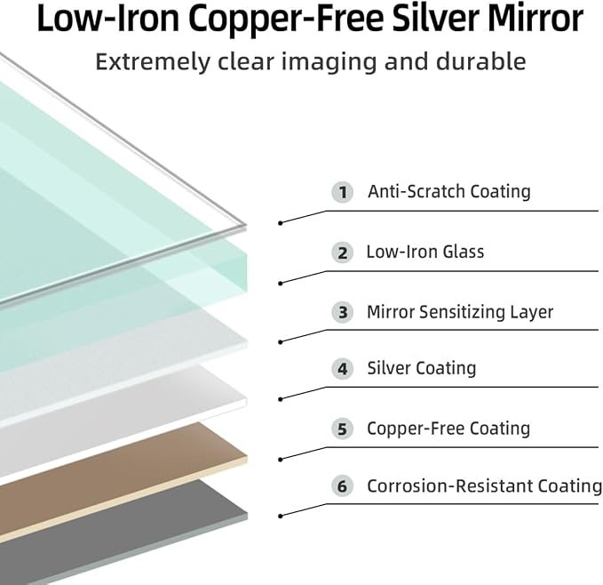 - 【Low-iron, Copper-free Silver Mirror】: nolsia arched led bathroom mirror is made with 5mm low-iron silver-backed glass that has a reflection rate of up to 98%, providing clear, distortion-free images. It’s processed with Italian-imported equipment, resulting in smooth, even edges. The copper-free silver coating helps prevent rust and extends the mirror’s lifespan. Additionally, the glass is treated to be shatter-resistant for added safety.