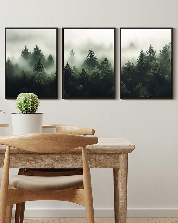 KUVIOKE Green Fog Pine Tree Framed Wall Art Nature Nordic Forests Artwork Morden Painting Home Decor 12x16in (Black Framed)