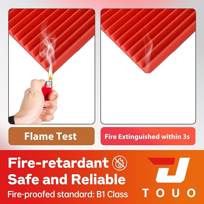 - ★ 【FIRE-RESISTANT & SAFE】:Our high-density acoustic foam features built-in flame-resistant properties, allowing it to self-extinguish within 1 minute when exposed to fire, preventing flame spread and reducing fire hazards. Designed with strong fire resistance and breathability, these acoustic panels sound absorbing help reduce fire hazards while maintaining durability. Made from pure polyurethane, they are non-toxic, odor-free, and safe for daily use, ensuring healthy indoor air quality. These soundproofing panels for walls and sound deadening panels work as an effective noise blocker for rooms, enhancing overall wall soundproofing panels.