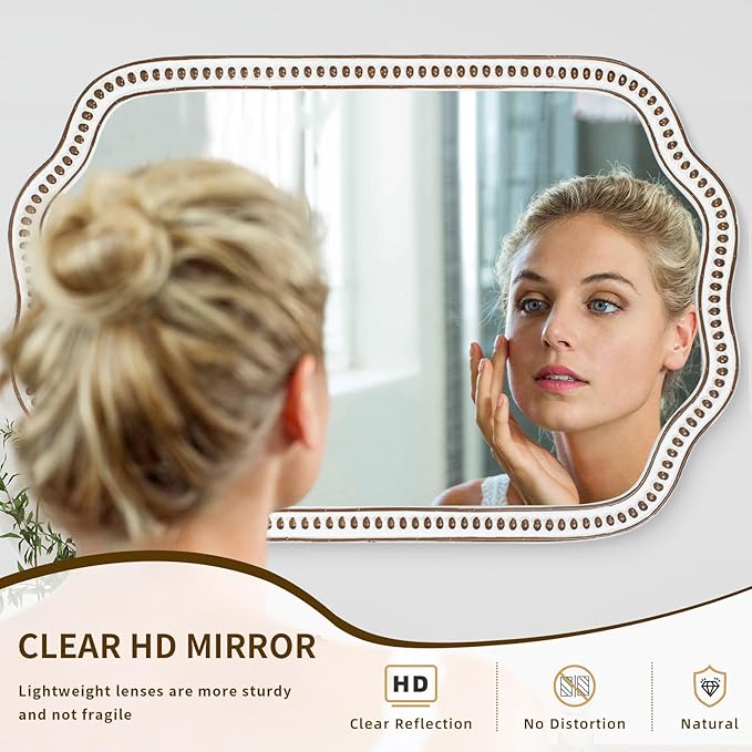- Farmhouse Elegance with a Scalloped Frame: Add rustic charm to any space with this beautifully scalloped farmhouse wall mirror. The distressed white finish offers vintage appeal, making it an ideal accent mirror for wall decor in your living room, entryway, or bathroom