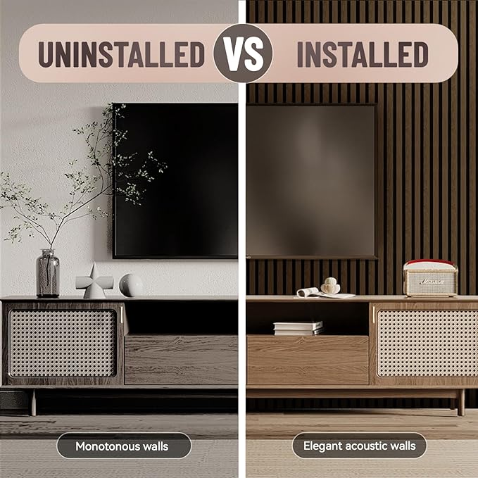 - ENVIRONMENTALLY FRIENDLY AND SOUND INSULATION: Our acoustic wood slat wall panels are made of high-quality MDF and high-density polyester, which is not only durable, but also not only environmentally friendly, but also free of harmful substances. The sound absorption coefficient of these sound-absorbing panels is up to 0.95, which can effectively reduce noise and improve indoor acoustics.