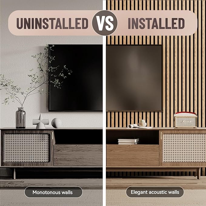 - ENVIRONMENTALLY FRIENDLY AND SOUND INSULATION: Our acoustic wood slat wall panels are made of high-quality MDF and high-density polyester, which is not only durable, but also not only environmentally friendly, but also free of harmful substances. The sound absorption coefficient of these sound-absorbing panels is up to 0.95, which can effectively reduce noise and improve indoor acoustics.