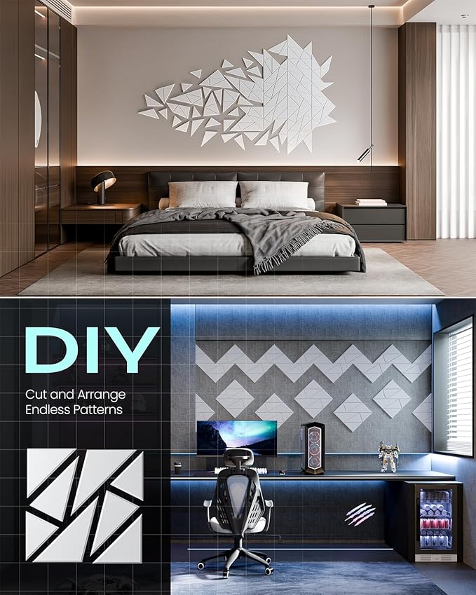 - Outstanding Noise Reduction Performance: These geometric acoustic wall panels can effectively absorb echoes and background noise, making them suitable for various settings such as home offices, recording studios, gaming rooms, and apartments. They ensure clearer audio for your calls and recordings, and creates a quiet and relaxing space atmosphere