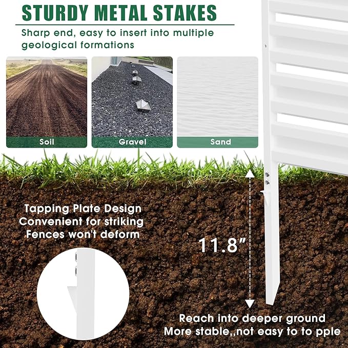 - STABLE STRUCTURE - Our AC fence is equipped with 12-inch ground stakes. The metal ground stakes can be inserted into the ground to a depth of 12 inches, firmly fixing the trash can fence to the ground, making the fence more stable and enhancing its wind resistance performance. The fence panel adopts a reinforced rib design, which ensures the fence won't deform, bend or break, making it more sturdy