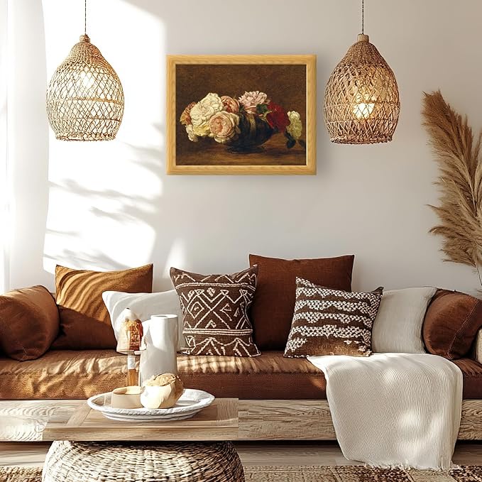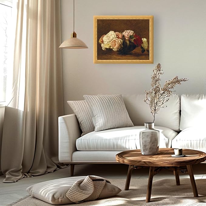 - Elegant Rose Arrangement in Classic Realism: This 16x20 inch canvas print features “Roses in a Bowl” by Henri Fantin-Latour. Delicate cream, blush, and red blooms rest in a shaded bowl, perfect for vintage floral interiors and traditional French-style rooms.