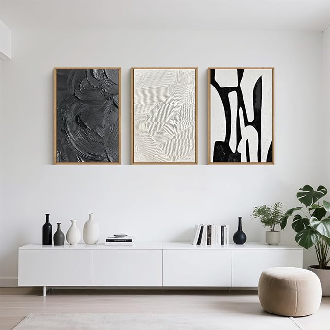 - 【Textured Black and White Wall Art】The Size of the framed canvas wall art set is: 16x24 inchx3pcs (40x60cmx3pcs).This set of three framed abstract paintings features striking contrasts. Black and white tones are combined with textured brushstrokes, creating a modern and minimalist visual effect.