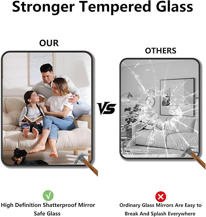 - Safe & Secure Tempered Glass: Built with shatterproof tempered glass and rust-resistant aluminum frame, this wall mirror for bathroom mounts securely above sinks. Steam-proof design withstands daily showers and heavy use—zero cracks, rust, or warping. Sleek, reliable, and perfect for high-traffic bathrooms: clear reflections, durable protection.