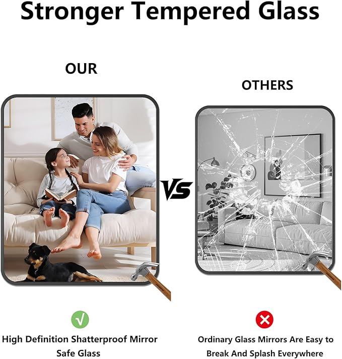 - Safe & Secure Tempered Glass: Built with shatterproof tempered glass and rust-resistant aluminum frame, this wall mirror for bathroom mounts securely above sinks. Steam-proof design withstands daily showers and heavy use—zero cracks, rust, or warping. Sleek, reliable, and perfect for high-traffic bathrooms: clear reflections, durable protection.