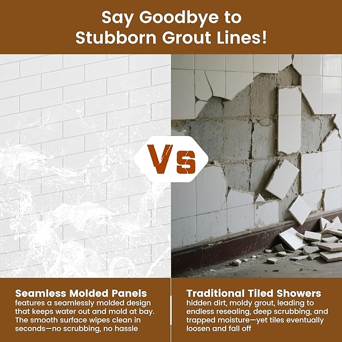 - ✅ Durable SMC Solid Surface:An upgrade from normal solid surface materials! Made from high-quality SMC solid surface, these shower wall panels resist chipping, peeling, and staining—offering both beauty and long-lasting durability. With low water absorption, they effectively prevent odors, sagging, and warping, even with daily use.