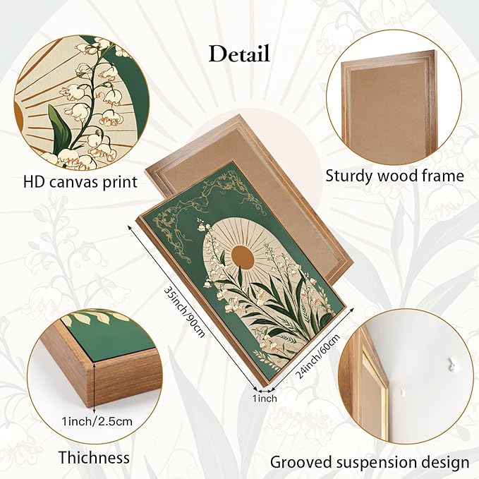 - SUN AND FLORAL WALL ART: The decorative paintings feature a celestial and botanical design with a harmonious blend of earthy tones and gold accents. They skillfully integrate elements of nature and celestial bodies to create a fresh and elegant aesthetic that is perfect for a vintage-inspired space.