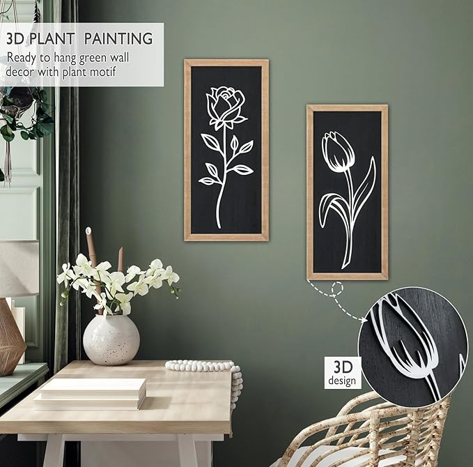 3D Wooden Black and White Floral Framed Wall Decor of 2, 7"X16" Farmhouse Vintage Boho Minimalist Flower Wall Art for Living Room, Rustic Retro Moody Vertical Tulip Rose Botanical Wall Sculptures