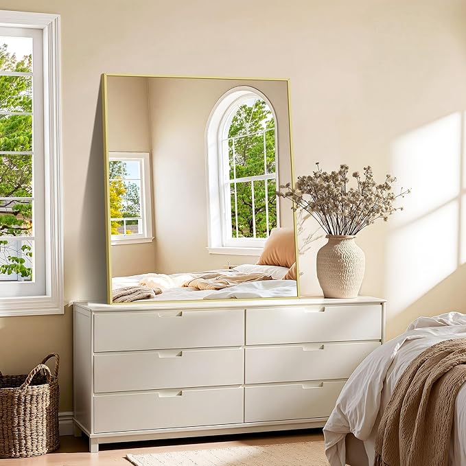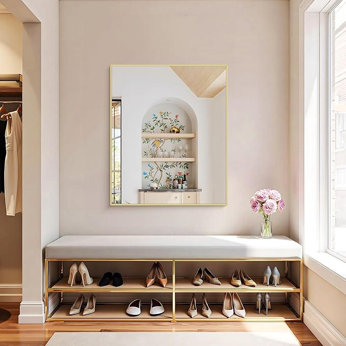 - MODERN DESIGN : KOCUUY 30x36 gold vanity mirror is with innovative design which gives the wall mirror a more fashion feel. With a classic square corner, the wall mounted mirror allows for creativity and functionality in bathroom, bedroom, entryway and anywhere else. Let your living space be an expression of your personal style, not limited to modern or contemporary, farmhouse or industrial