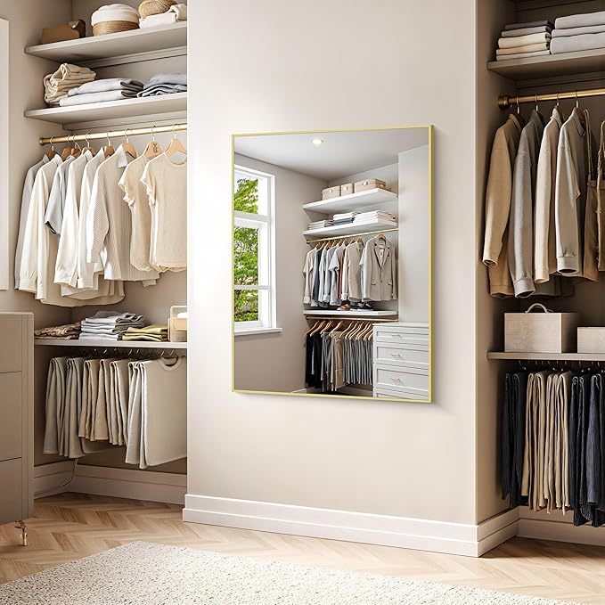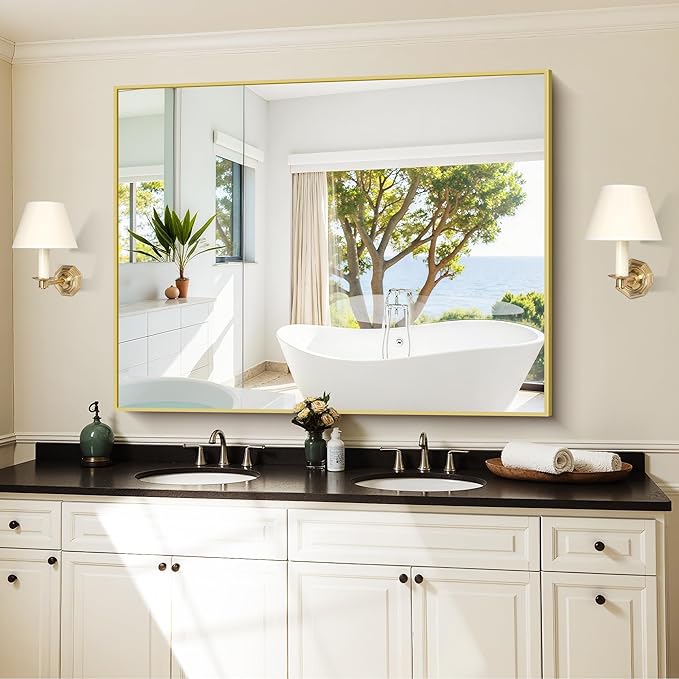 - MODERN DESIGN : KOCUUY 36x48 gold vanity mirror is with innovative design which gives the wall mirror a more fashion feel. With a classic square corner, the wall mounted mirror allows for creativity and functionality in bathroom, bedroom, entryway and anywhere else. Let your living space be an expression of your personal style, not limited to modern or contemporary, farmhouse or industrial