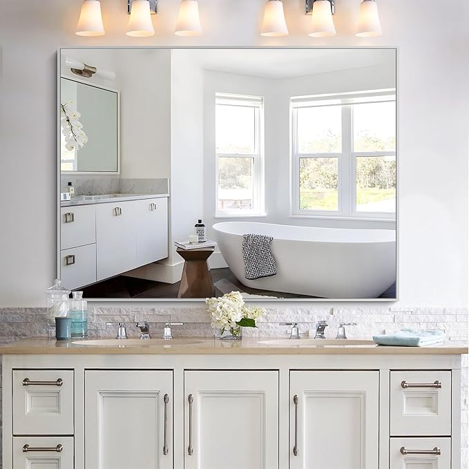 - MODERN DESIGN : KOCUUY 36x48 silver vanity mirror is with innovative design which gives the wall mirror a more fashion feel. With a classic square corner, the wall mounted mirror allows for creativity and functionality in bathroom, bedroom, entryway and anywhere else. Let your living space be an expression of your personal style, not limited to modern or contemporary, farmhouse or industrial