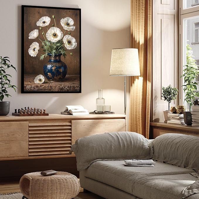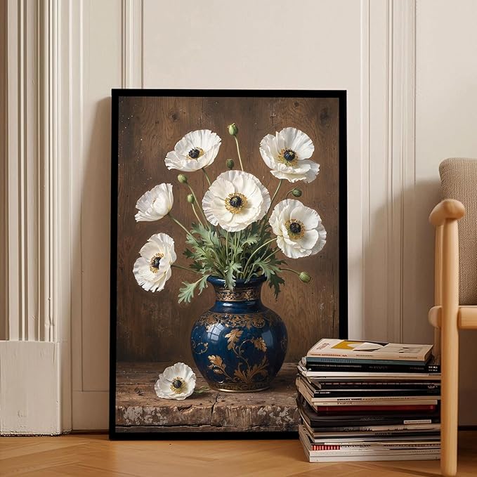Vintage white poppy flowers canvas painting ornate blue vase gold floral pattern rustic textured wood background ruffled petals green leaves vertical composition botanical wall art home decor