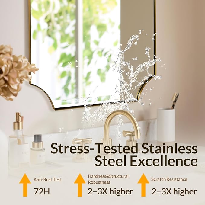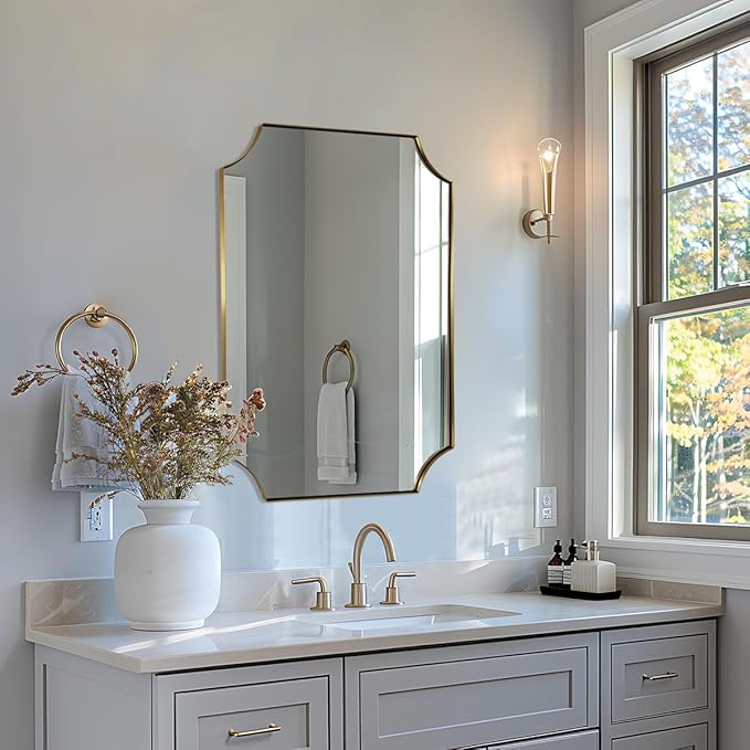 - Elegant Scalloped Edge Design: Our brass bathroom mirror has a beautifully sculpted frame. Its intricately curved scalloped edges and notched arcs at each corner make it stand out—perfect for sprucing up your bathroom decor.