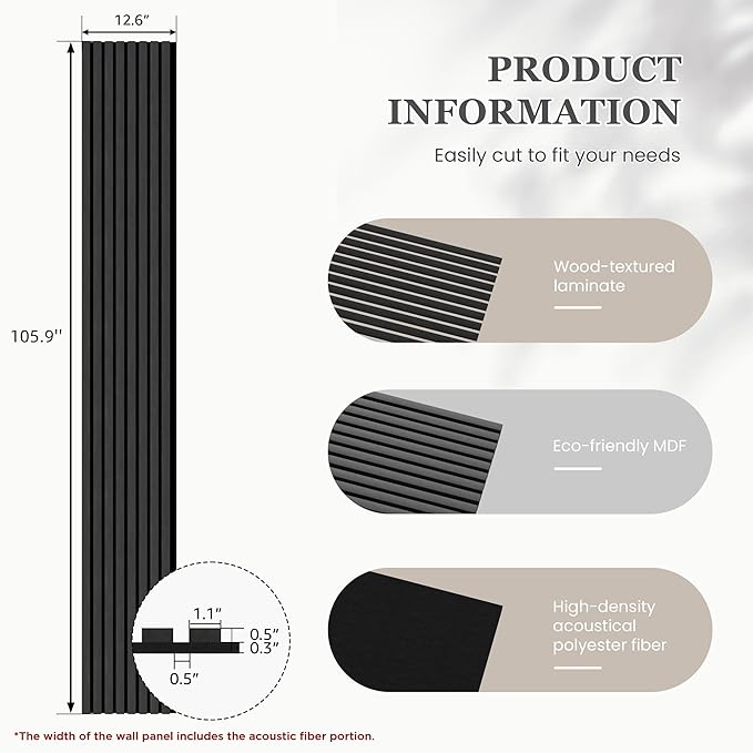 - Package Includes: 2 piece acoustic wood wall panels, each measuring 105.9" x 12.6" x 0.8", covering about 18.5 sq.ft. Recommended to order a sample first to confirm the color for your project to place the final order