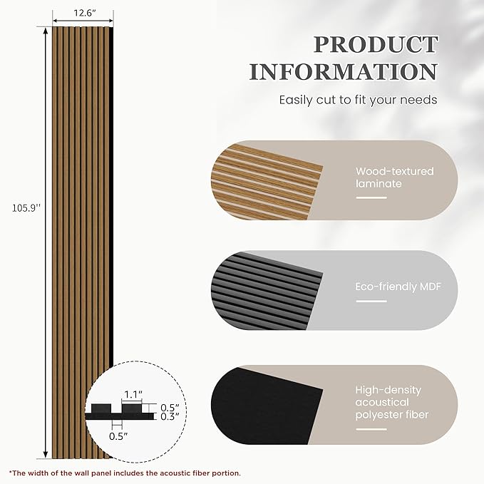 - Package Includes: 4 piece acoustic wood wall panels, each measuring 105.9" x 12.6" x 0.8", covering about 37.1 sq.ft. Recommended to order a sample first to confirm the color for your project to place the final order