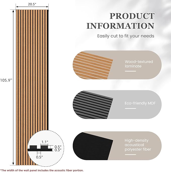 - Package Includes: 2 piece acoustic wood wall panels, each measuring 105.9" x 20.5" x 0.8", covering about 30.1 sq.ft. Recommended to order a sample first to confirm the color for your project to place the final order