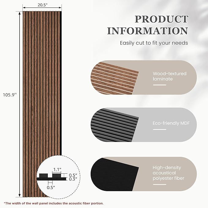 - Package Includes: 2 piece acoustic wood wall panels, each measuring 105.9" x 20.5" x 0.8", covering about 30.1 sq.ft. Recommended to order a sample first to confirm the color for your project to place the final order