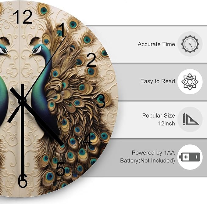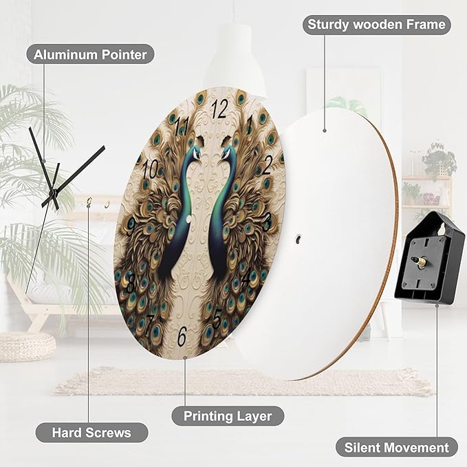 Black and Gold Peacock Bird-Themed Circular Wall Clock, Semi-Dark-Toned Peacock Room Personalized Decoration On The Grey High-End Background Wall, Wooden Silent Wall Clock 12x12INCH