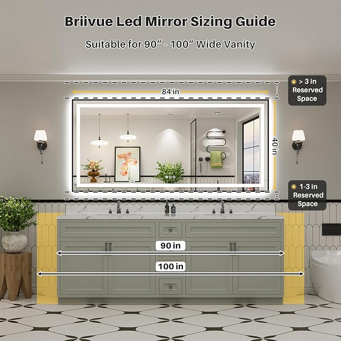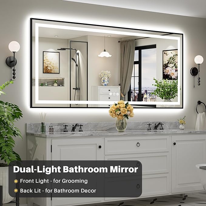 - [Adjustable Lighting & Memory] Easily customize your black lighted bathroom mirror lighting with adjustable color temperatures (3000K/4000K/6000K) and dimmable brightness (10%-100%). The smart memory function saves your settings for the next use.