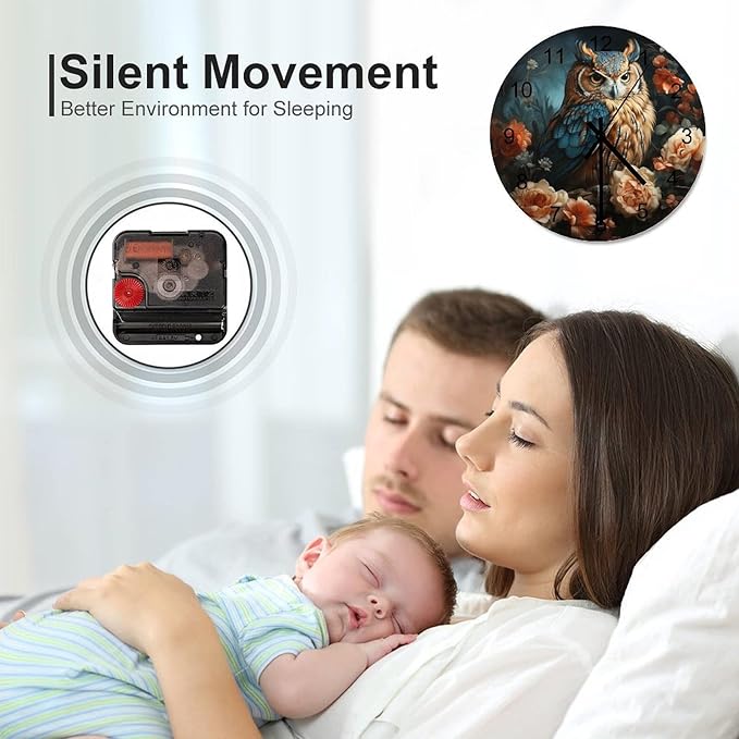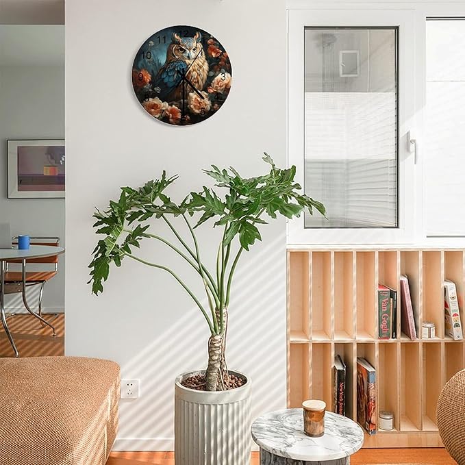 Owl-Themed Round Wall Clock, Rose Retro Art Style for Those Who Stay Up Late, Watercolor Cartoon Owl Handsome, Wooden Silent Wall Clock for The Bedroom 12x12INCH