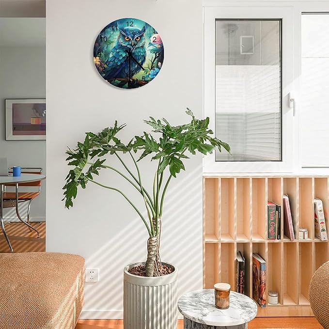 Blue Owl Watercolor Cartoon Round Wall Clock, Forest Flower Butterfly Background Handsome Owl Bird Theme, Wooden Silent Wall Decoration Wall Clock For Boys' And Girls' Bedrooms 12x12INCH