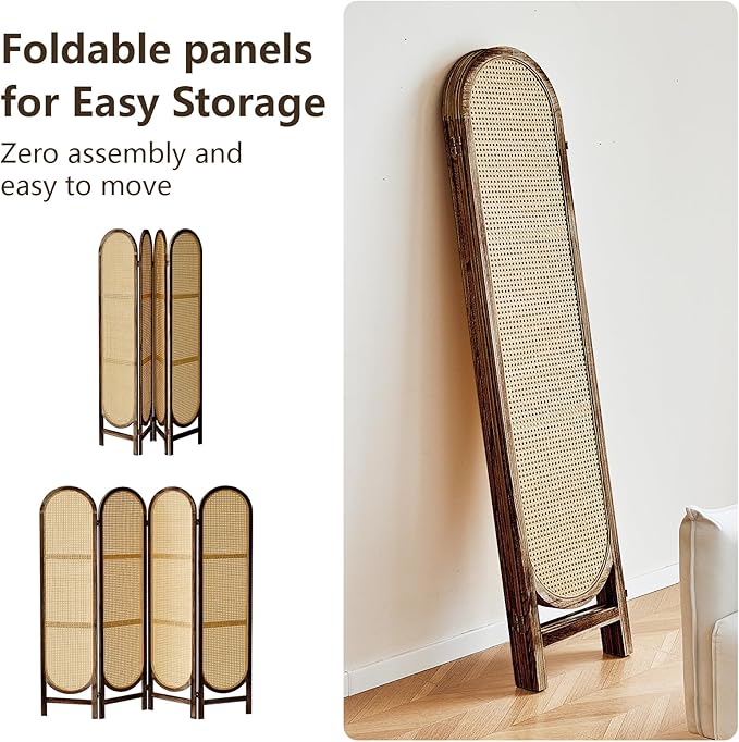 4 Panels Room Dividers and Hand-Woven Rattan Room Divider Wall, Wood Room Divider Folding Privacy Screens for Home Office Bedroom, Brown