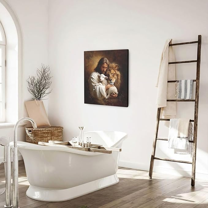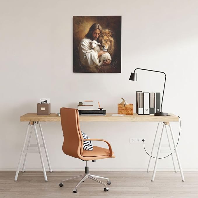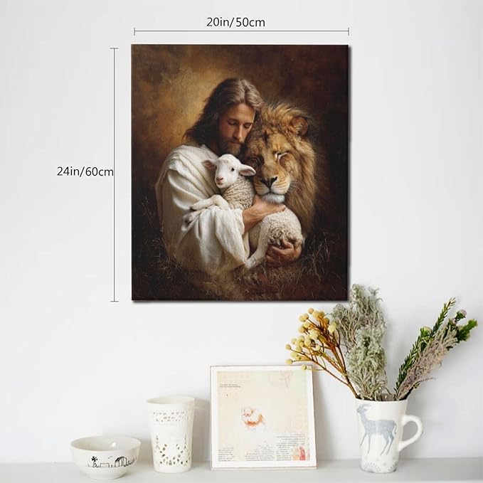 Jesus Lion Lamb Wall Art Christian Jesus Wall Decor Lion of Judah Pictures Religious God Canvas Painting Print Christ Artwork Decoration for Living Room Bedroom Church Framed Gifts 20”X24”