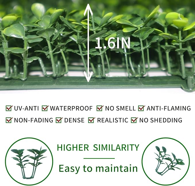 - Easy DIY Installation: With interlocking connectors and a porous base, easy and flexible installation is allowed for our artificial boxwood panels on wood frames, chain link fences, or backdrop walls. Your space will be effortlessly enhanced, both indoors and outdoors, as the aesthetics of walls, roofs, fences, balconies, gardens, and backyards are elevated.