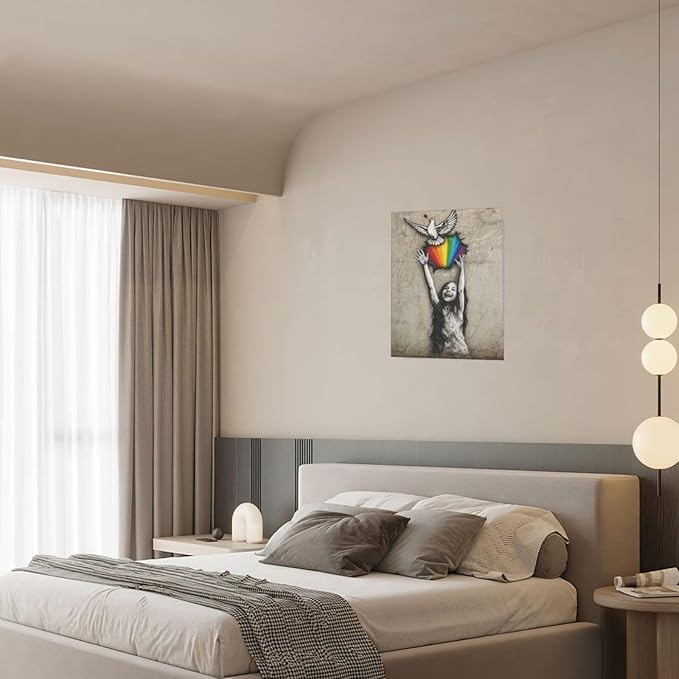 Banksy Street Graffiti Wall Art Rainbow Canvas Wall Decor Love And Peace Pictures Paintings Prints Artwork Framed Modern Decorations For Bedroom Bathroom Office Living Room Gifts 12" x 16"