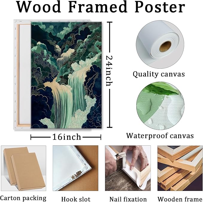 Mountain River Wall Art Japanese Waterfall Painting Abstract Forest Art Poster Blue And Green Abstract Canvas Japanese Style Print Blue And Green Landscape Wall Art Waterfall Artwork 16x24in Framed