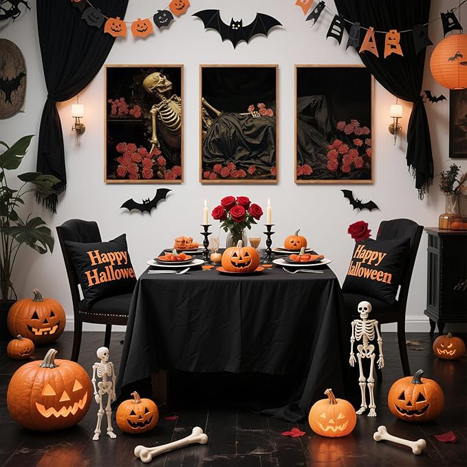 - Gothic Roses Skeleton Wall Art-- Aurlan dark moody halloween wall art set explores the themes of life and death, beauty and decay through the combination of skeletons and red roses. The dark background and meticulous light and shadow rendering imbue the image with a strong sense of artistry and philosophical depth.