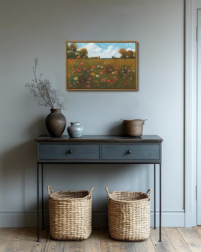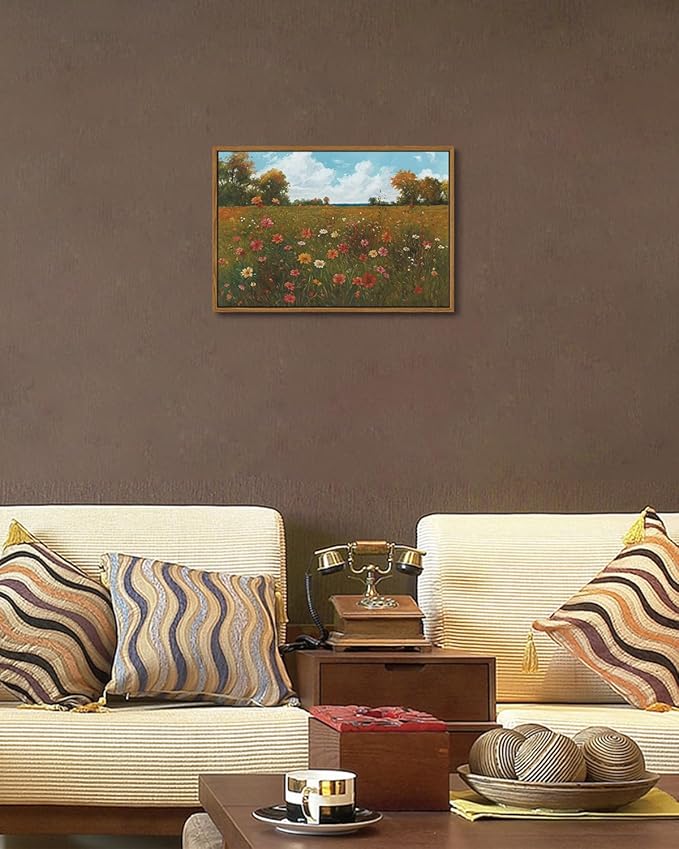 - Floral Field Landscape Decor: Bursting with colorful tones—from vivid pinks of the blooms to warm greens of the grass and soft blues of the sky—this wall art complements diverse spaces. Perfect for bedroom decor to add a tranquil vibe, bathroom to bring a touch of nature, or living room to create a rustic farmhouse atmosphere. Whether your home has a modern or classic style, its vintage floral charm fits right in.